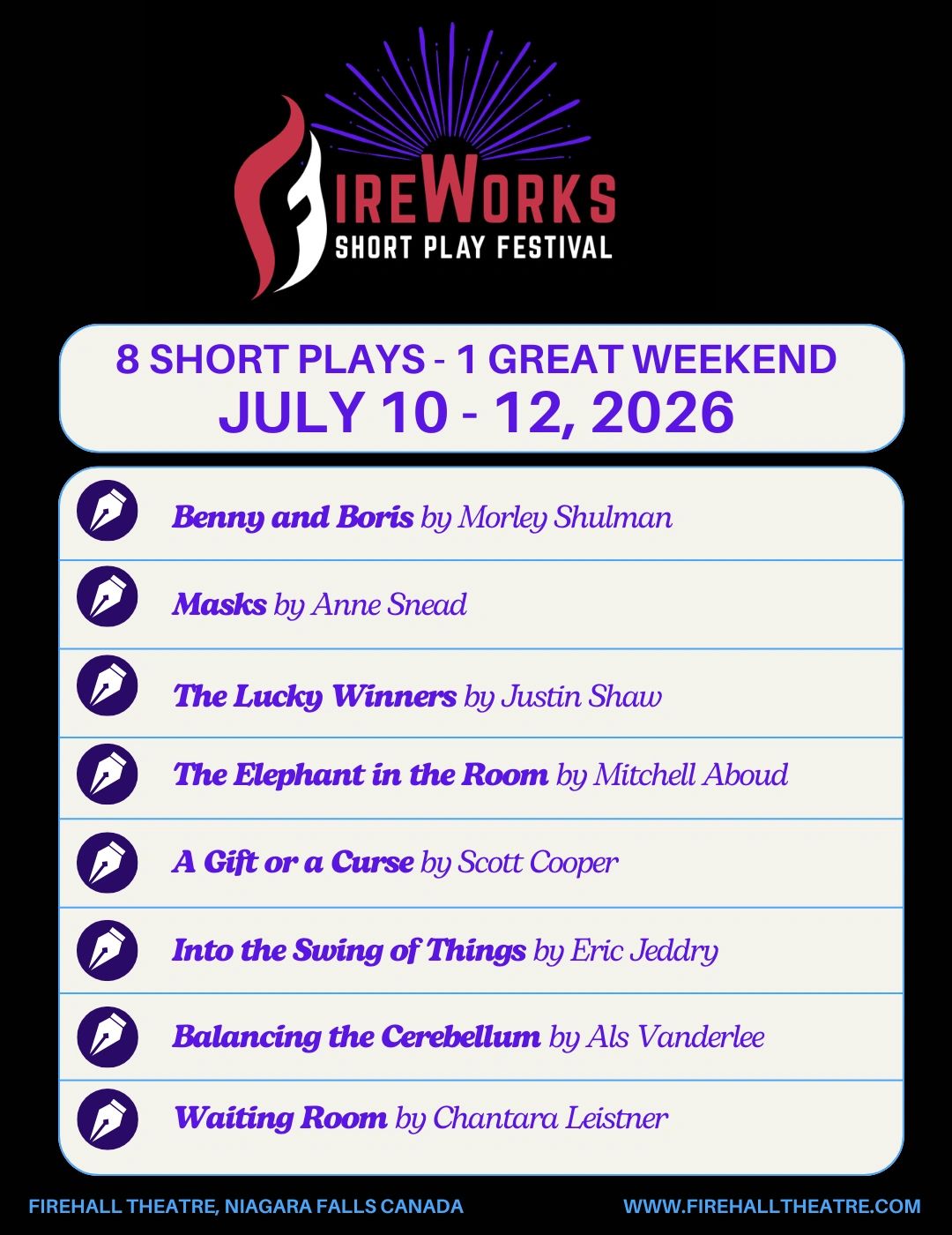 The FireWorks Short Play Festival is a weekend of original, Canadian 10-minute plays. Below, you will find the lineup for this year's festival! Each performance features the full slate of short plays!